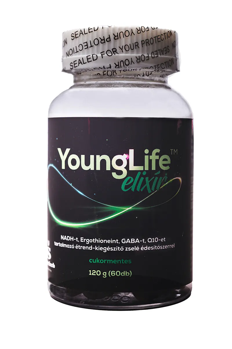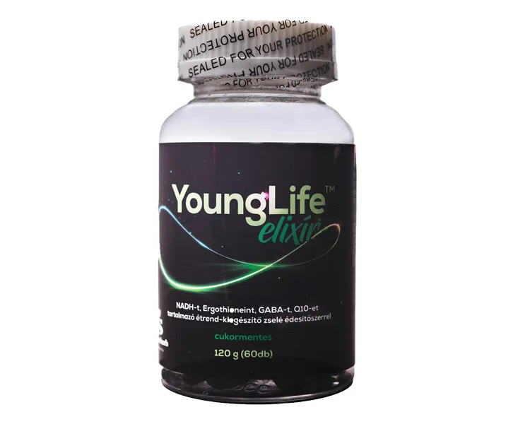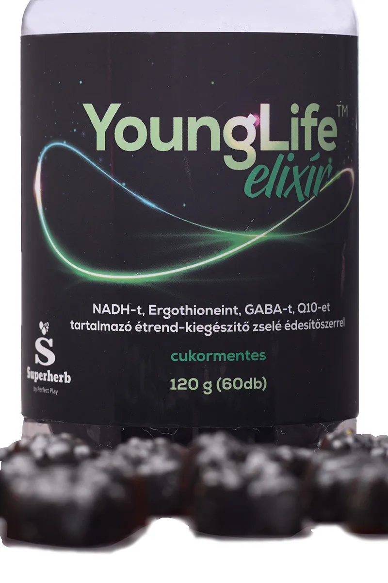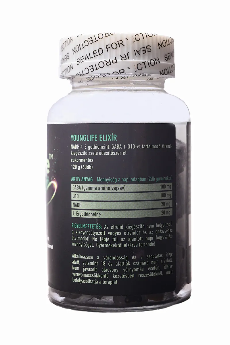 YoungLife elixír: NADH-t, Ergothioneint, GABA-t, Q10-et tartalmazó étrend-kiegészítő zselé édesítőszerrel.