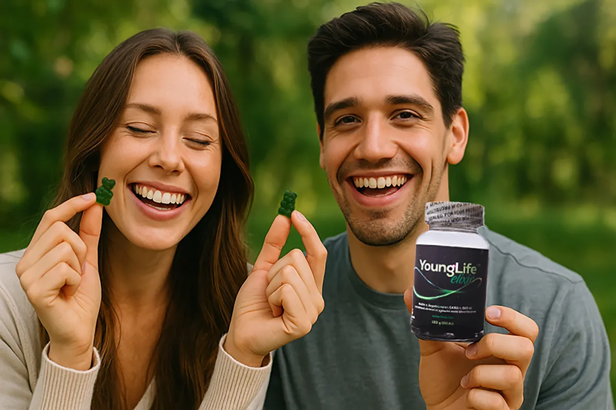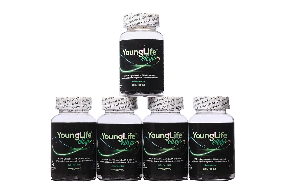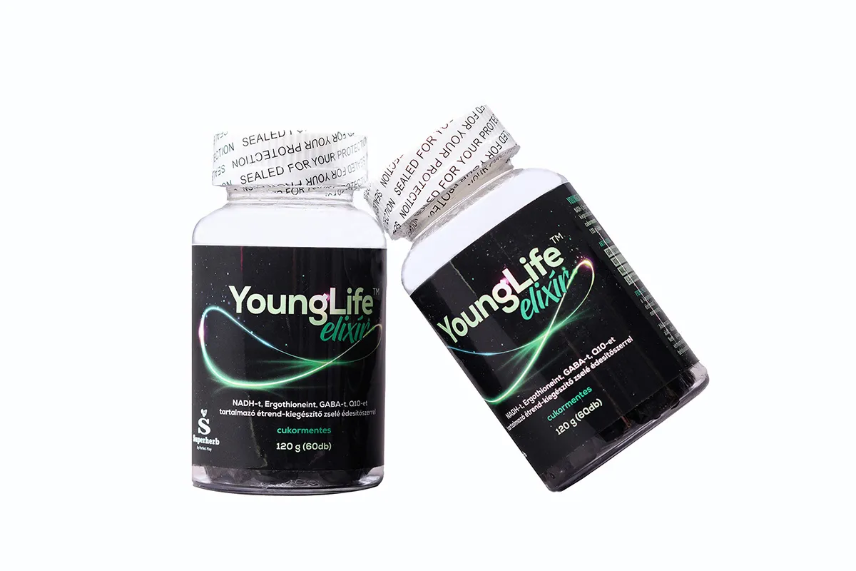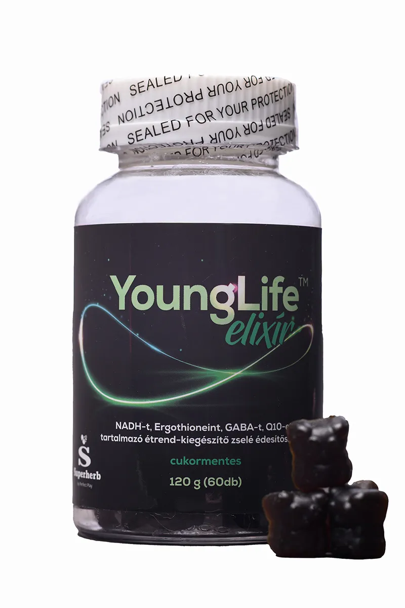 YoungLife elixír: NADH-t, Ergothioneint, GABA-t, Q10-et tartalmazó étrend-kiegészítő zselé édesítőszerrel.